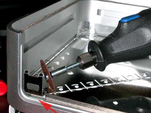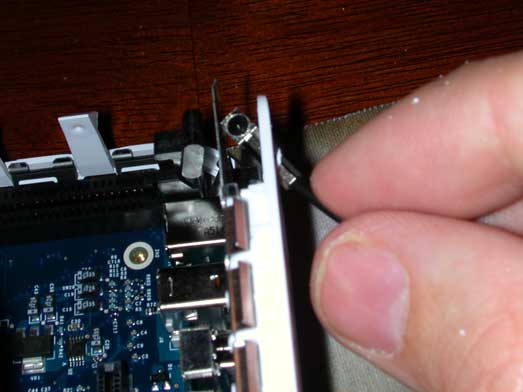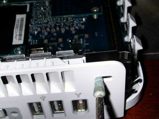 The most logical place to run the AirPort antenna externally is through the security hole on the back right side. The only other choice would have had us drilling holes in the vents and the hood that funnels air out the back of the Mac Mini. Least invasive is good, so I took a dremel to the widen that hole up. I made a circular opening the same diameter as the existing width of the security hole. Now that the hole is wide enough, route the AirPort antenna back through this new opening. Make sure not to cut the antenna cord on the metal shielding. Route the AirPort antenna back through this new opening. Make sure not to cut the antenna cord on the metal shielding. After you connect the AirPort antenna back to the AirPort extreme card, make sure that you leave the cable lying next to the slot the drive and fan assembly goes back into. Here is a picture of the how the antenna cable routes through the small opening that is designed to the left drive and fan assembly slot. This is where Apple intended the AirPort antenna to go. We are just taking a detour. Now we are ready to put the cover back on the Mini, but since we have the AirPort antenna going out the security slot, we will need to cut the metal anchor off. I sliced it right at the bottom, marked in the larger photo. I have found it extremely useful to take your putty knife and push on the shielding on the back side of the Mini when you are snapping the cover back on. Otherwise you will just bend the clips when you are pushing it together. And just in case your asking, yes, a putty knife is the standard tool for taking apart a Mac Mini. Here is a final picture of the back of the Minis after they are all back together. Here you can see the AirPort antennas sitting comfortably out the back. No signal interference now! Here you can see the AirPort antennas sitting out the back of each Mac Minis. This was the reason I started my network project. I have 3 servers right on my home office desk with all the comforts of a full fledged NOC in less than 1 square foot of space. Final front view of 3 Mac Mini server right on my home office desk wiht all the comforts of a full fledged NOC in less than 1 square foot of space.That's it! If you have any questions, please let me know. Or perhaps, maybe you have some ideas on what I could work on for version two of the network?