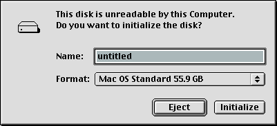 To initalize your new FireWire drive under Mac OS X, simply plug your drive into your computer. Upon mounting the new drive, you will see this dialog box. Click on Initialize to proceed.